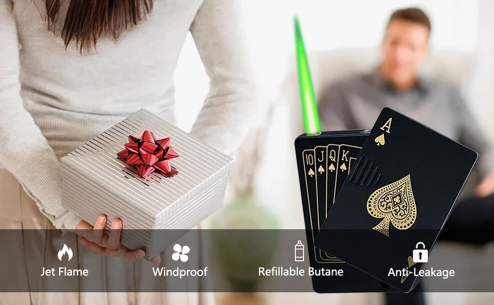 This cool design lighter with green flame is made of multi-layer plating process, cast in aluminium and zinc alloy, corrosion-resistant, rust-proof and non-fading, with a poker design on the front and a unique scissors ignition.